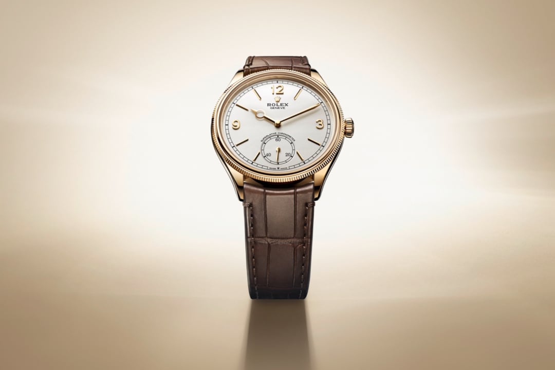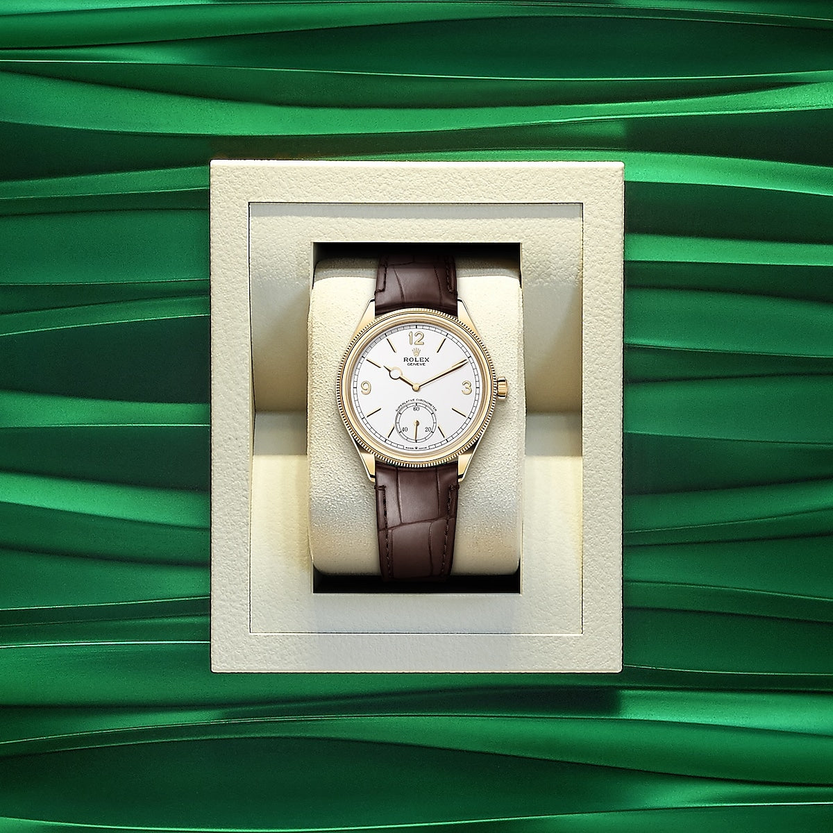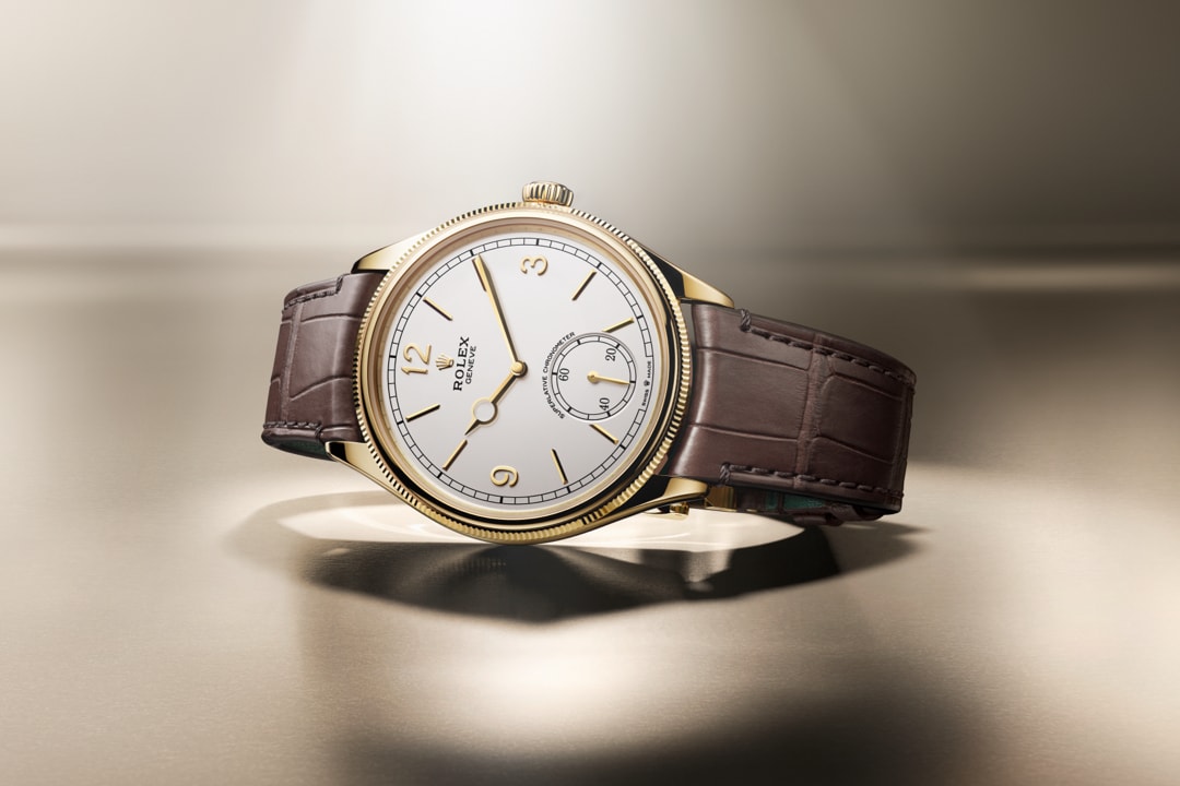 Unworn watch Rolex Perpetual 1908, 39mm, 18k Yellow Gold, Ref# 52508-0006. Striving for the highest level of quality to achieve flawless, long-lasting results is the life philosophy of Rolex. It is in this vein that the global brand has developed a classic collection of watches with a new name and a new look, modestly dressy, ideal for a business suit - Rolex Perpetual 1908. Paying homage to the year in which the "Rolex" lettering first appeared on the dials, the entire Perpetual 1908 model inspired by the watchmaker's first creation to feature a self-winding rotor. Proof of this is the stunning Intense White dial with superbly long and narrow 18k Yellow Gold applied indexes and Arabic numerals at 12, 3 and 9 o'clock. At 6 o'clock is a small seconds dial, sportier than you might expect, with 20, 40 and 60 on the track. An elegant sword-shaped minute hand with a classic hour hand marked with a ring at the tip, made of 18k Yellow Gold. A well-readable minute scale is applied along the outer contour of the dial. All this charm is complemented by a ribbed, for a comfortable grip, domed screw-down crown in 18k Yellow Gold with the Rolex logo.? The dial is covered with a scratch-resistant sapphire crystal. The highlight of the model is the two-tiered 18k Yellow Gold bezel with a convex and tactile upper part and a characteristic grooved lower part. The model is powered by the in-house automatic Rolex mechanical movement caliber 7140, new 2023, contains 38 jewels and has an approximate power reserve of approximately 66 hours. The mesmerizing work of the mechanism can be seen through the transparent case back. This impressive watch is presented on a matte brown alligator leather strap with green lining and tone-on-tone stitching, custom made for this model. It is fitted with an 18k Yellow Gold Dualclasp folding clasp. Thanks to its carefully shaped design, the Dualclasp is always centered on the wrist for maximum comfort. Water resistant up to 50m/165ft (5 ATM).